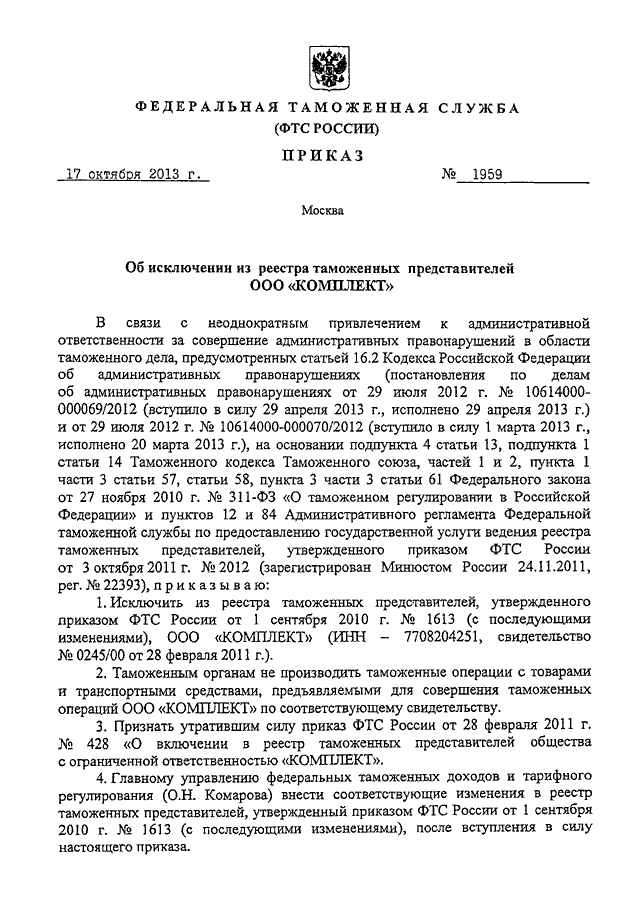 ПРИКАЗ ФТС РФ от 17.10.2013 N 1959