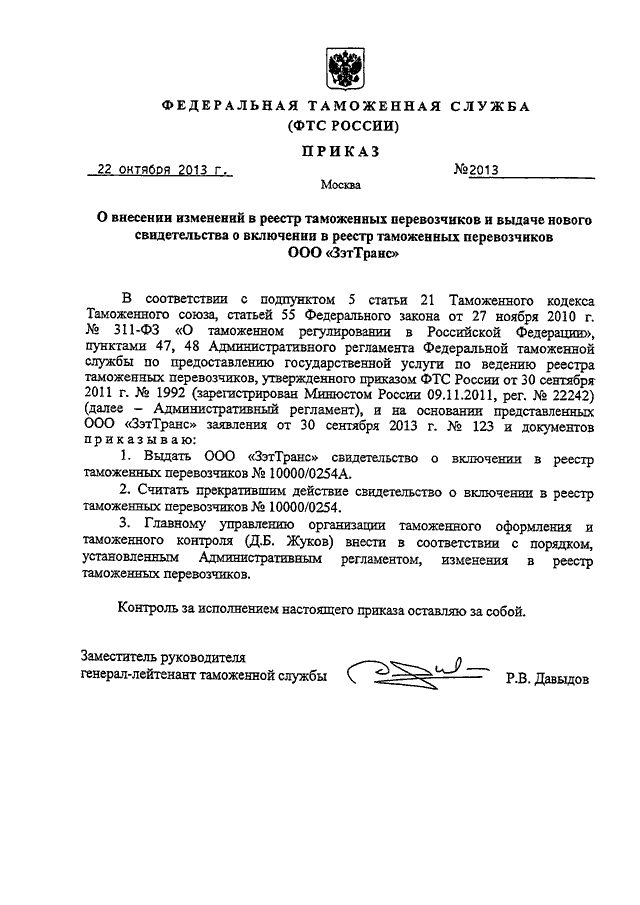 "О ВНЕСЕНИИ ИЗМЕНЕНИЙ В РЕЕСТР ТАМОЖЕННЫХ ПЕРЕВОЗЧИКОВ И ВЫДАЧЕ НОВОГО СВИДЕТЕЛЬСТВА О ВКЛЮЧЕНИИ В РЕЕСТР ТАМОЖЕННЫХ ПЕРЕВОЗЧИКОВ ООО "ЗЭТТРАНС"