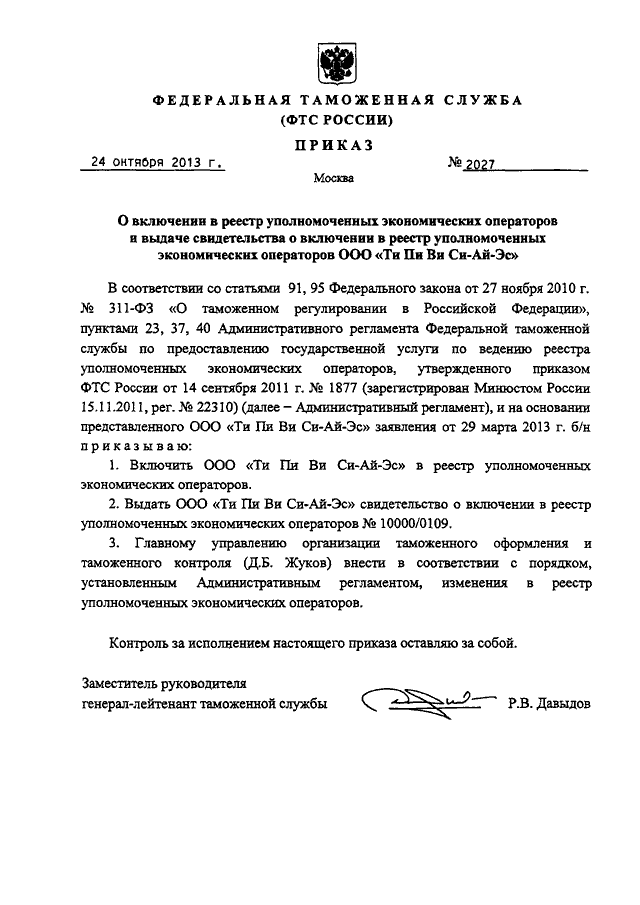 "О ВКЛЮЧЕНИИ В РЕЕСТР УПОЛНОМОЧЕННЫХ ЭКОНОМИЧЕСКИХ ОПЕРАТОРОВ И ВЫДАЧЕ СВИДЕТЕЛЬСТВА О ВКЛЮЧЕНИИ В РЕЕСТР УПОЛНОМОЧЕННЫХ ЭКОНОМИЧЕСКИХ ОПЕРАТОРОВ ООО "ТИ ПИ ВИ СИ-АЙ-ЭС"