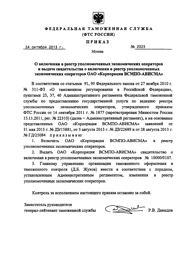 "О ВКЛЮЧЕНИИ В РЕЕСТР УПОЛНОМОЧЕННЫХ ЭКОНОМИЧЕСКИХ ОПЕРАТОРОВ И ВЫДАЧЕ СВИДЕТЕЛЬСТВА О ВКЛЮЧЕНИИ В РЕЕСТР УПОЛНОМОЧЕННЫХ ЭКОНОМИЧЕСКИХ ОПЕРАТОРОВ ОАО "КОРПОРАЦИЯ ВСМПО-АВИСМА"