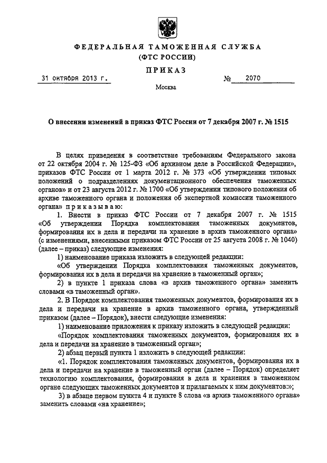 ПРИКАЗ ФТС РФ от 31.10.2013 N 2070