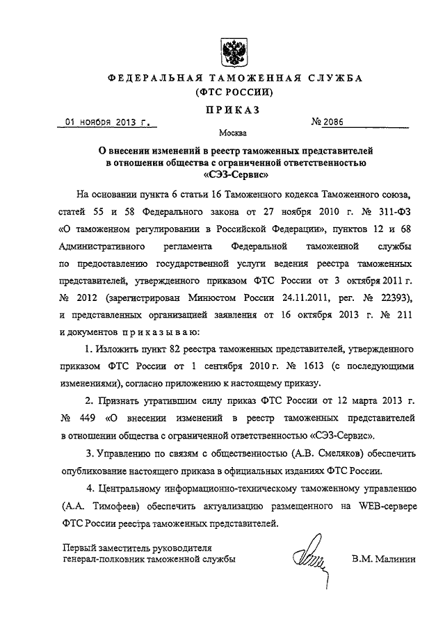 ПРИКАЗ ФТС РФ от 01.11.2013 N 2086