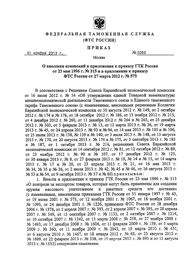 ПРИКАЗ ФТС РФ от 01.11.2013 N 2083