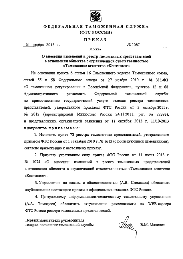 ПРИКАЗ ФТС РФ от 01.11.2013 N 2087