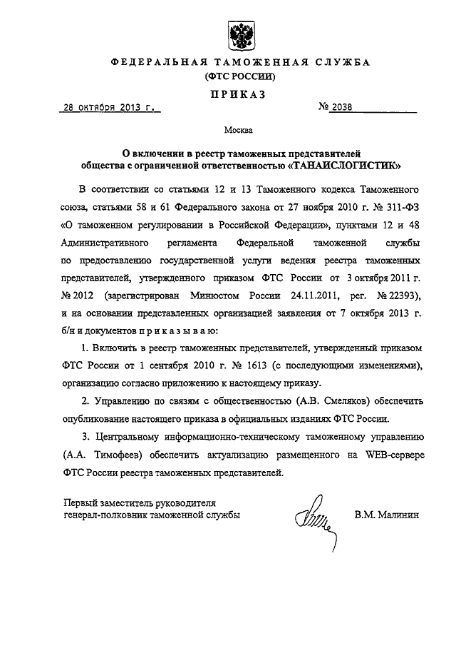 ПРИКАЗ ФТС РФ от 28.10.2013 N 2038