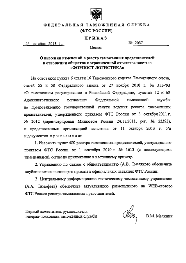 "О ВНЕСЕНИИ ИЗМЕНЕНИЙ В РЕЕСТР ТАМОЖЕННЫХ ПРЕДСТАВИТЕЛЕЙ В ОТНОШЕНИИ ОБЩЕСТВА С ОГРАНИЧЕННОЙ ОТВЕТСТВЕННОСТЬЮ "ФОРПОСТ ЛОГИСТИКА"