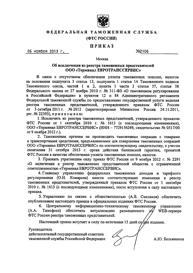 ПРИКАЗ ФТС РФ от 06.11.2013 N 2106