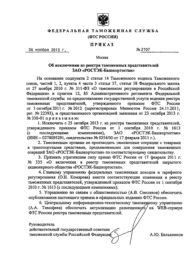 "ОБ ИСКЛЮЧЕНИИ ИЗ РЕЕСТРА ТАМОЖЕННЫХ ПРЕДСТАВИТЕЛЕЙ ЗАО "РОСТЭК-БАШКОРТОСТАН"