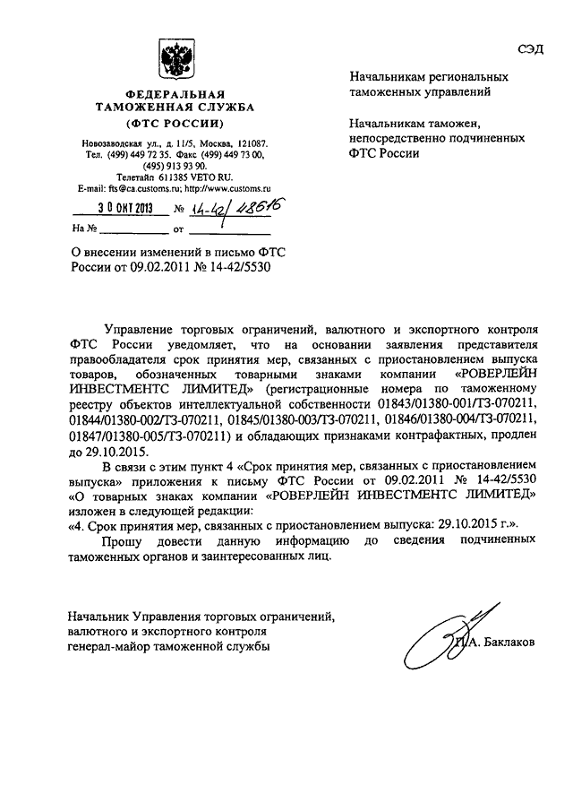 ПИСЬМО ФТС РФ от 30.10.2013 N 14-42/48616