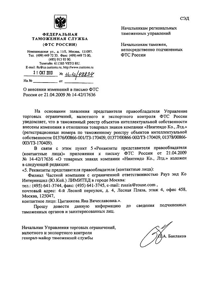 "О ВНЕСЕНИИ ИЗМЕНЕНИЙ В ПИСЬМО ФТС РОССИИ ОТ 21.04.2009 N 14-42/17636"