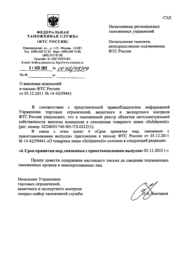 "О ВНЕСЕНИИ ИЗМЕНЕНИЙ В ПИСЬМО ФТС РОССИИ ОТ 05.12.2011 N 14-42/59441"