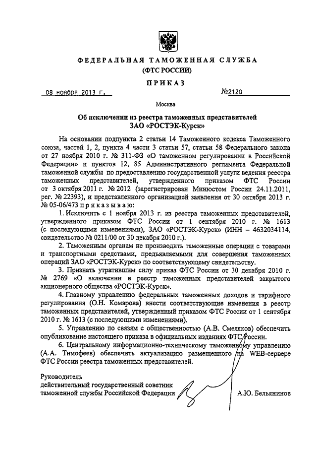 ПРИКАЗ ФТС РФ от 08.11.2013 N 2120