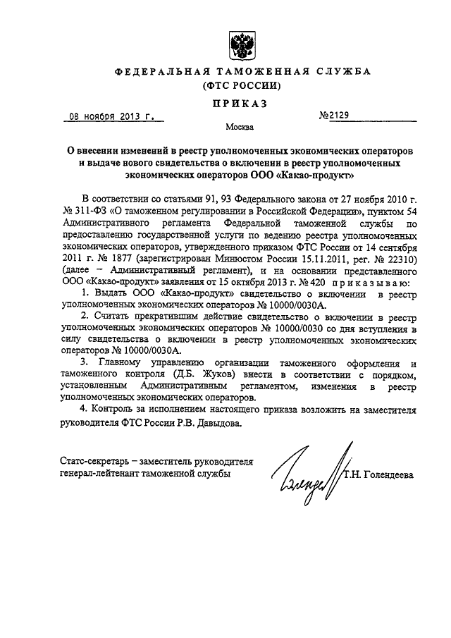 "О ВНЕСЕНИИ ИЗМЕНЕНИЙ В РЕЕСТР УПОЛНОМОЧЕННЫХ ЭКОНОМИЧЕСКИХ ОПЕРАТОРОВ И ВЫДАЧЕ НОВОГО СВИДЕТЕЛЬСТВА О ВКЛЮЧЕНИИ В РЕЕСТР УПОЛНОМОЧЕННЫХ ЭКОНОМИЧЕСКИХ ОПЕРАТОРОВ ООО "КАКАО - ПРОДУКТ"