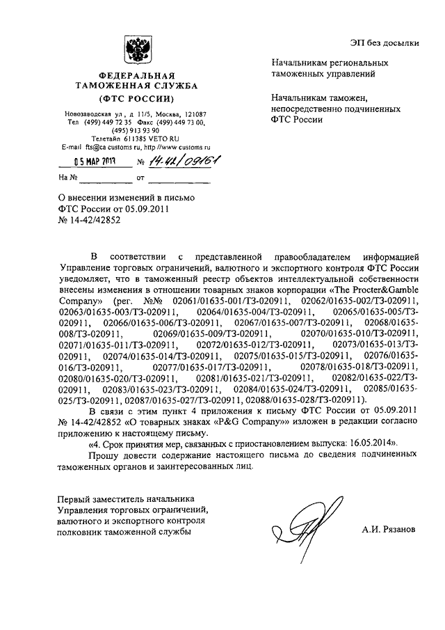 ПИСЬМО ФТС РФ от 05.03.2013 N 14-42/09161