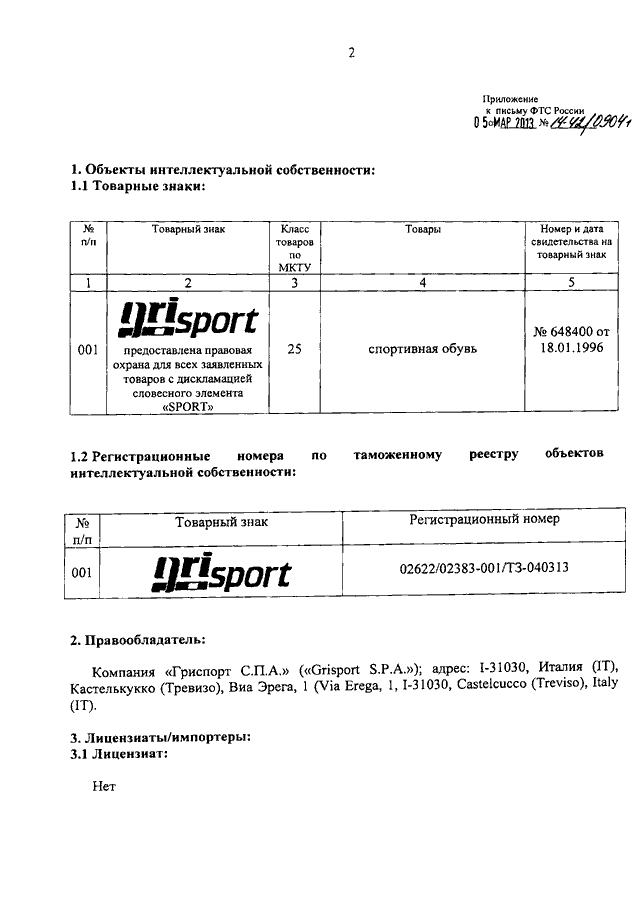 "О ТОВАРНОМ ЗНАКЕ КОМПАНИИ "GRISPORT S.P.A."