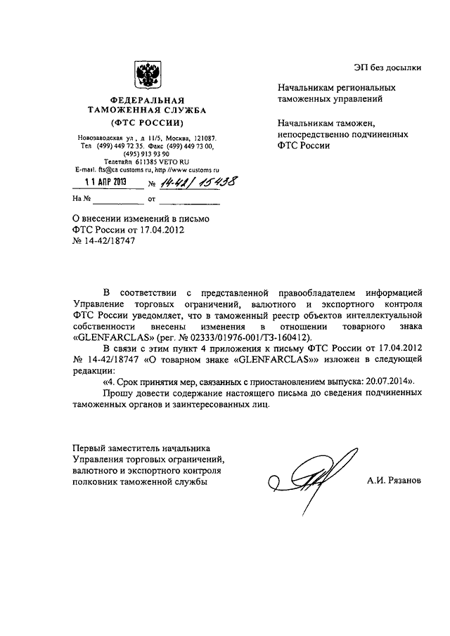 ПИСЬМО ФТС РФ от 11.04.2013 N 14-42/15438