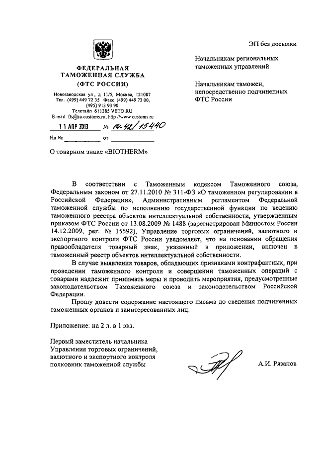 ПИСЬМО ФТС РФ от 11.04.2013 N 14-42/15440