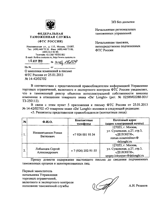 "О ВНЕСЕНИИ ИЗМЕНЕНИЙ В ПИСЬМО ФТС РОССИИ ОТ 25.01.2013 N 14-42/02702"