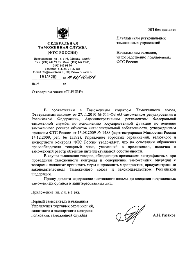 ПИСЬМО ФТС РФ от 16.04.2013 N 14-42/16207