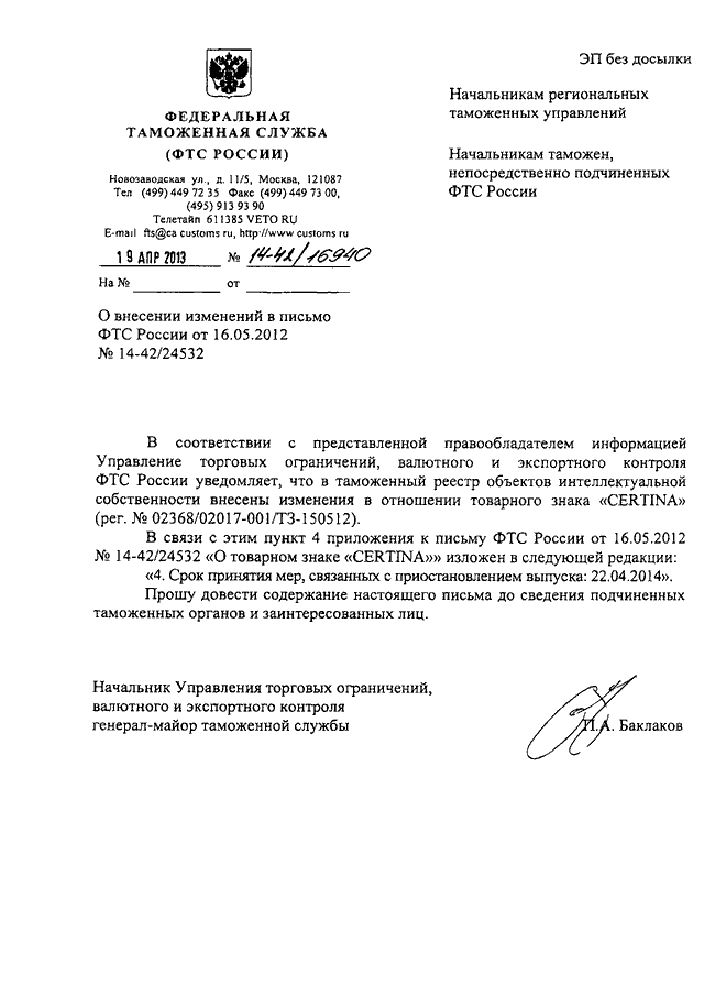 ПИСЬМО ФТС РФ от 19.04.2013 N 14-42/16940
