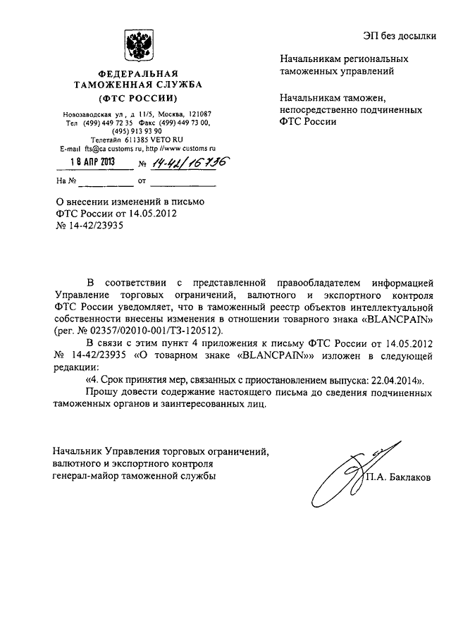 ПИСЬМО ФТС РФ от 18.04.2013 N 14-42/16736