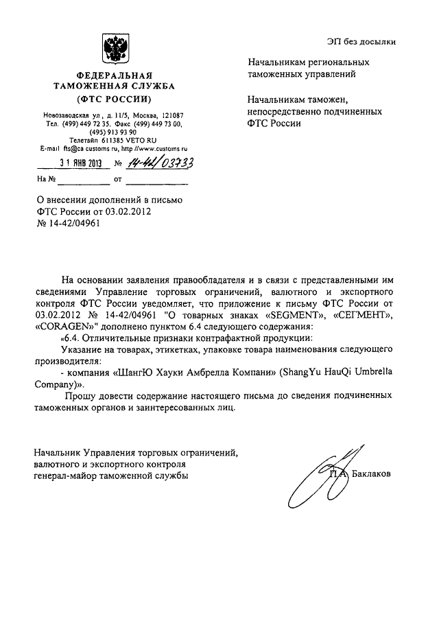 ПИСЬМО ФТС РФ от 31.01.2013 N 14-42/03733