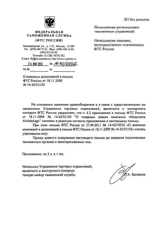 "О ВНЕСЕНИИ ДОПОЛНЕНИЙ В ПИСЬМО ФТС РОССИИ ОТ 18.11.2009 N 14-42/55105"