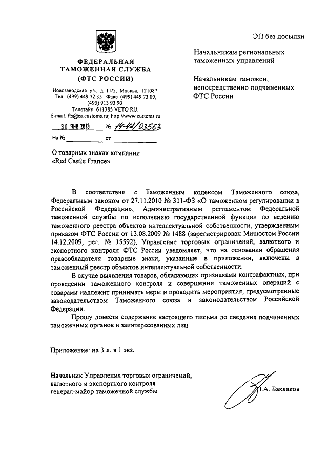 ПИСЬМО ФТС РФ от 30.01.2013 N 14-42/03563