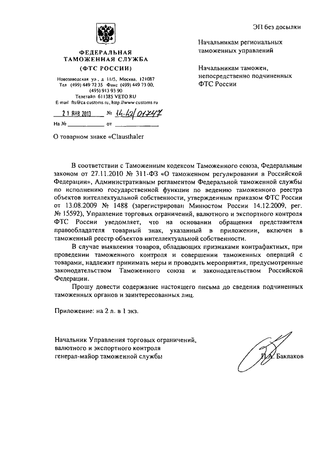 ПИСЬМО ФТС РФ от 21.01.2013 N 14-42/01747