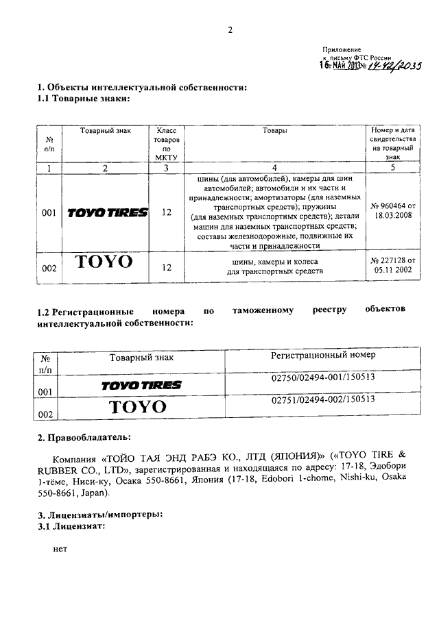 "О ТОВАРНЫХ ЗНАКАХ КОМПАНИИ "TOYO TIRE & RUBBER CO., LTD"