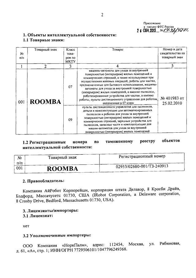 "О ТОВАРНОМ ЗНАКЕ "ROOMBA" КОМПАНИИ "IROBOT CORPORATION"