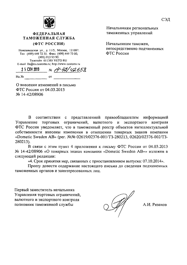ПИСЬМО ФТС РФ от 25.09.2013 N 14-42/42658