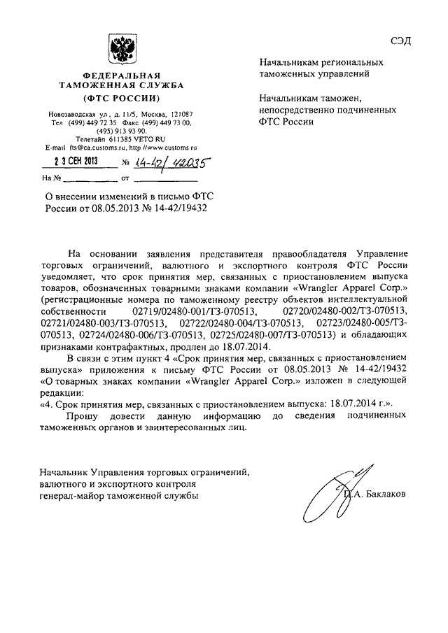 ПИСЬМО ФТС РФ от 23.09.2013 N 14-42/42035