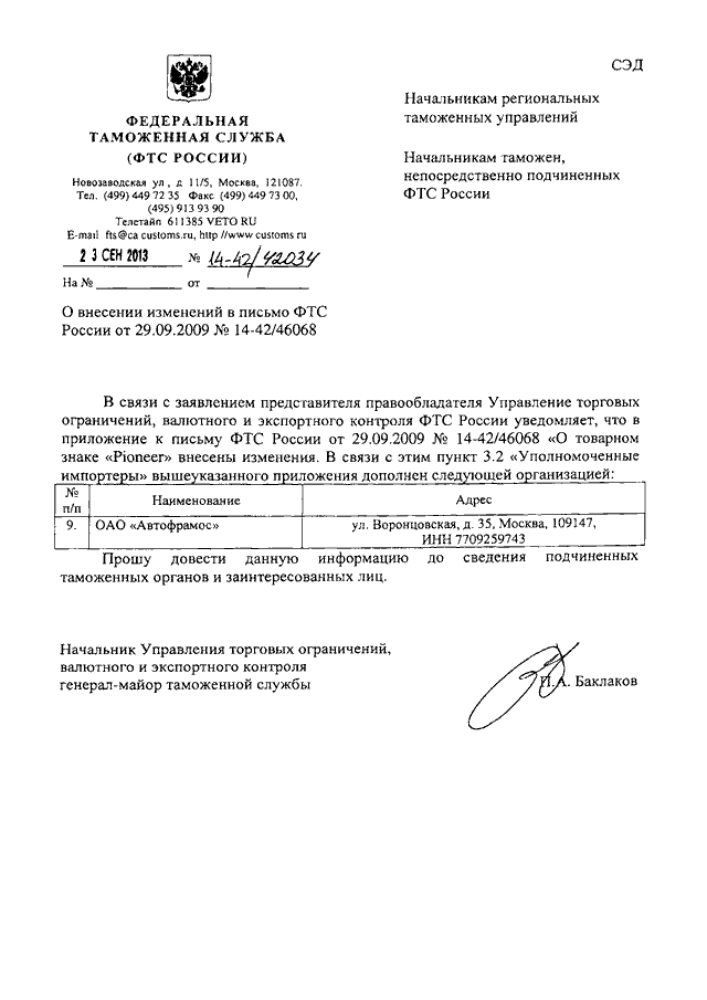 ПИСЬМО ФТС РФ от 23.09.2013 N 14-42/42034