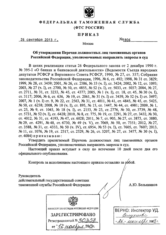 ПРИКАЗ ФТС РФ от 26.09.2013 N 1806