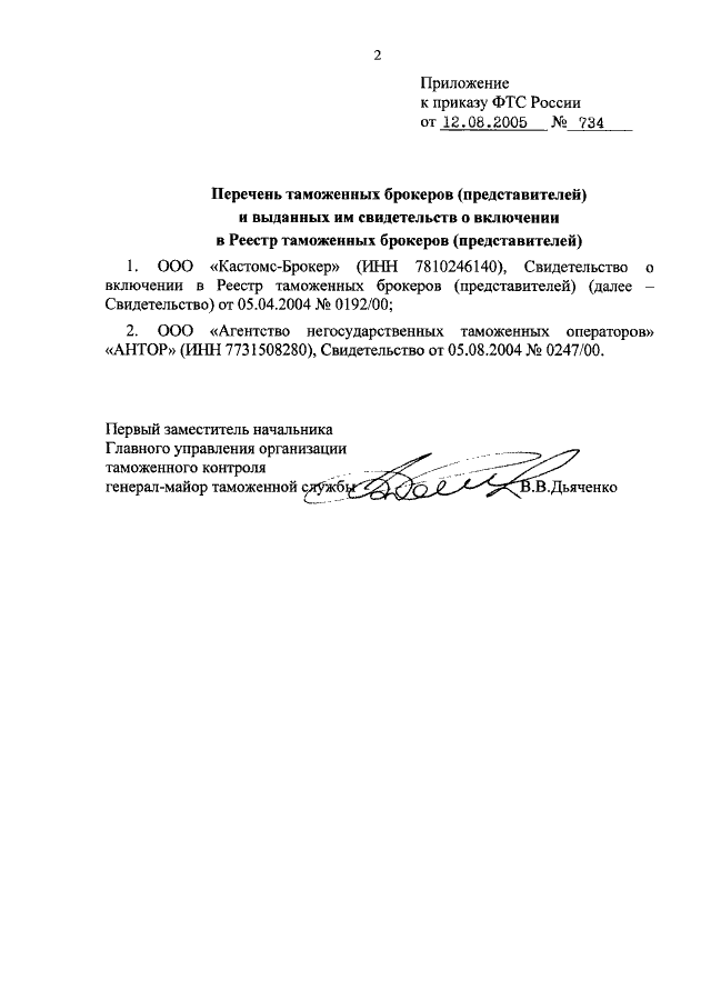 ПРИКАЗ ФТС РФ от 12.08.2005 N 734