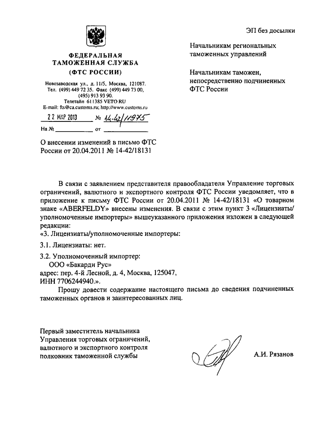 ПИСЬМО ФТС РФ от 22.03.2013 N 14-42/11975