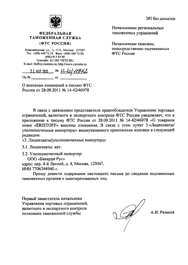 ПИСЬМО ФТС РФ от 22.03.2013 N 14-42/11972