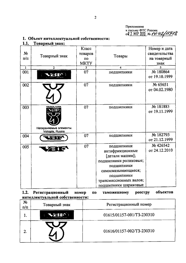 "О ВНЕСЕНИИ ИЗМЕНЕНИЙ В ПИСЬМА ФТС РОССИИ В ОТНОШЕНИИ ТОВАРНЫХ ЗНАКОВ ЗАО "ВОЛОГОДСКИЙ ПОДШИПНИКОВЫЙ ЗАВОД"