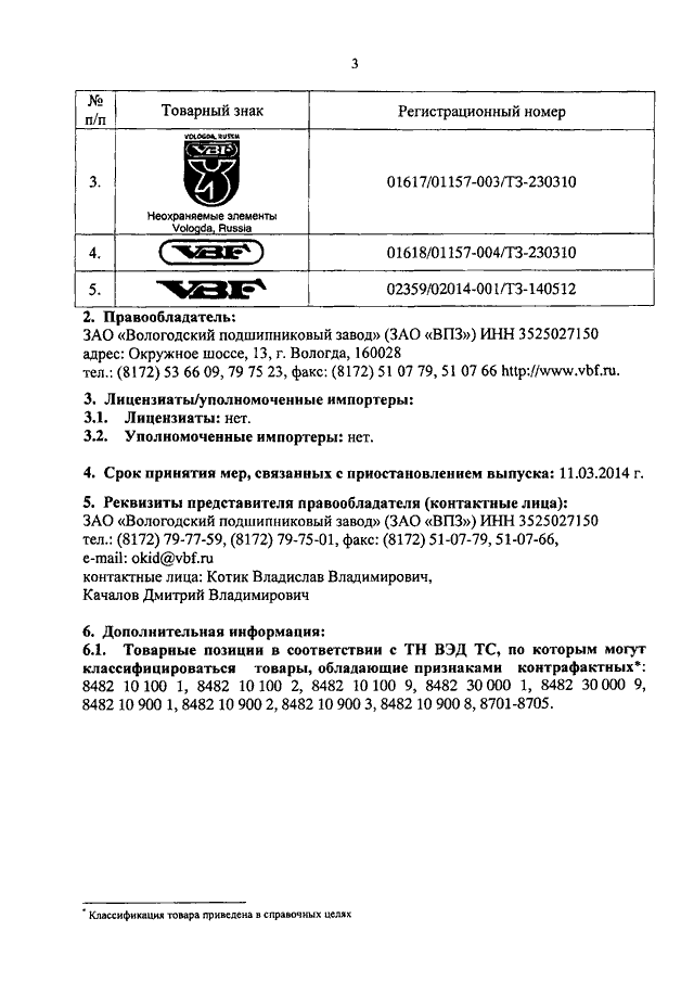 "О ВНЕСЕНИИ ИЗМЕНЕНИЙ В ПИСЬМА ФТС РОССИИ В ОТНОШЕНИИ ТОВАРНЫХ ЗНАКОВ ЗАО "ВОЛОГОДСКИЙ ПОДШИПНИКОВЫЙ ЗАВОД"