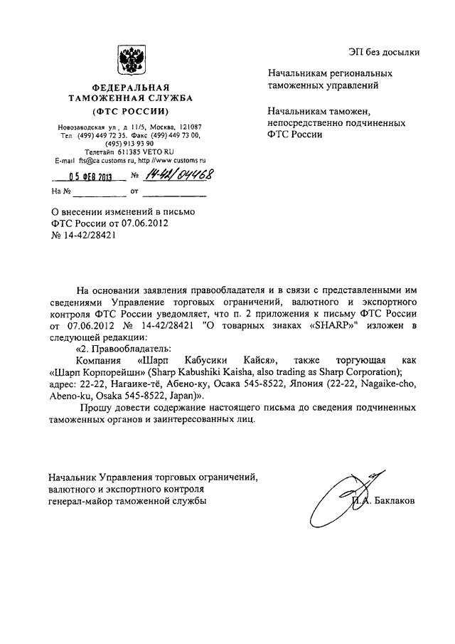 ПИСЬМО ФТС РФ от 05.02.2013 N 14-42/04468