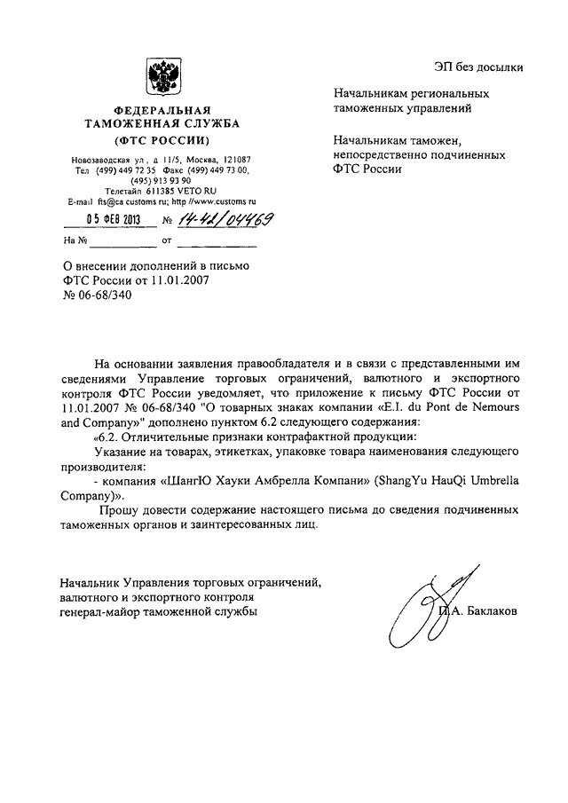 "О ВНЕСЕНИИ ДОПОЛНЕНИЙ В ПИСЬМО ФТС РОССИИ ОТ 11.01.2007 N 06-68/340"