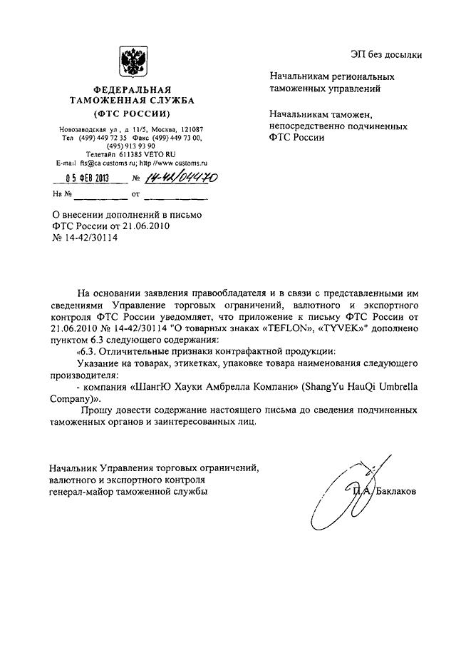 ПИСЬМО ФТС РФ от 05.02.2013 N 14-42/04470