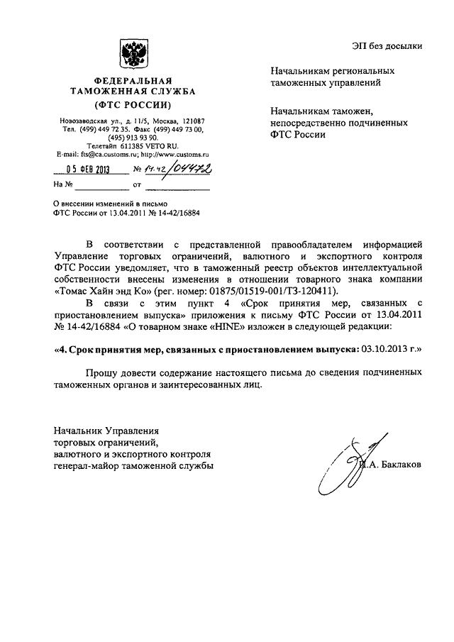 ПИСЬМО ФТС РФ от 05.02.2013 N 14-42/04472