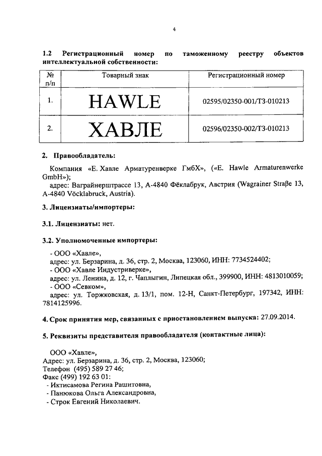 "О ТОВАРНЫХ ЗНАКАХ КОМПАНИИ "Е. ХАВЛЕ АРМАТУРЕНВЕРКЕ ГМБХ"