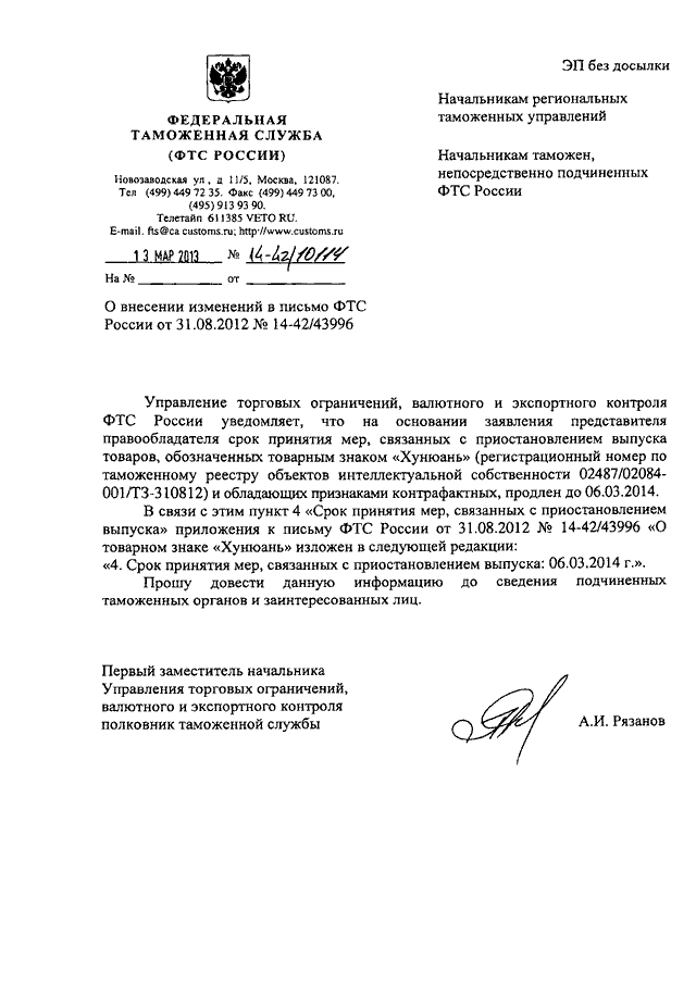 "О ВНЕСЕНИИ ИЗМЕНЕНИЙ В ПИСЬМО ФТС РОССИИ ОТ 31.08.2012 N 14-42/43996"
