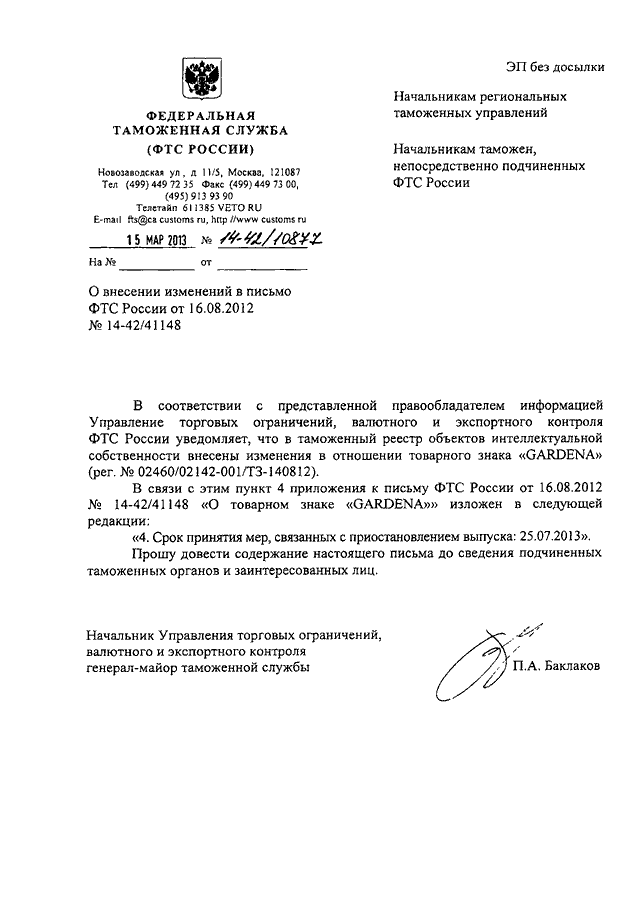 ПИСЬМО ФТС РФ от 15.03.2013 N 14-42/10877