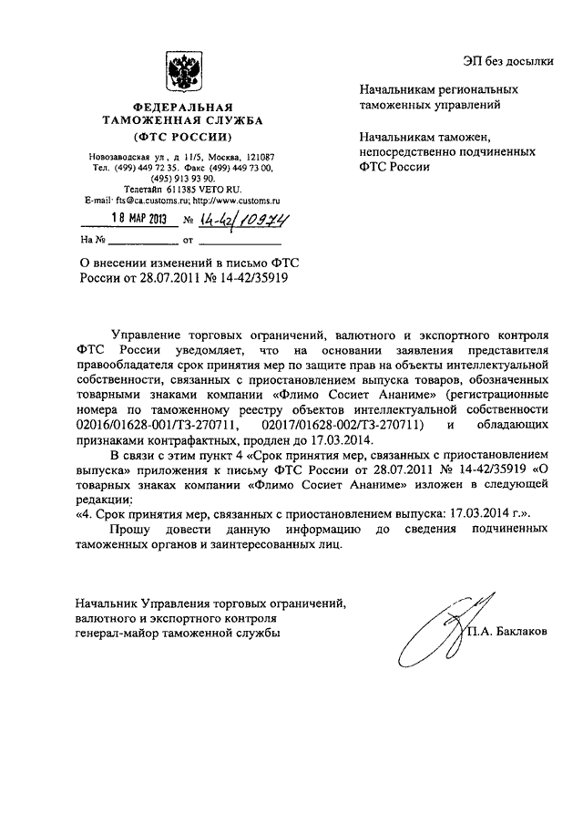 ПИСЬМО ФТС РФ от 18.03.2013 N 14-42/10974