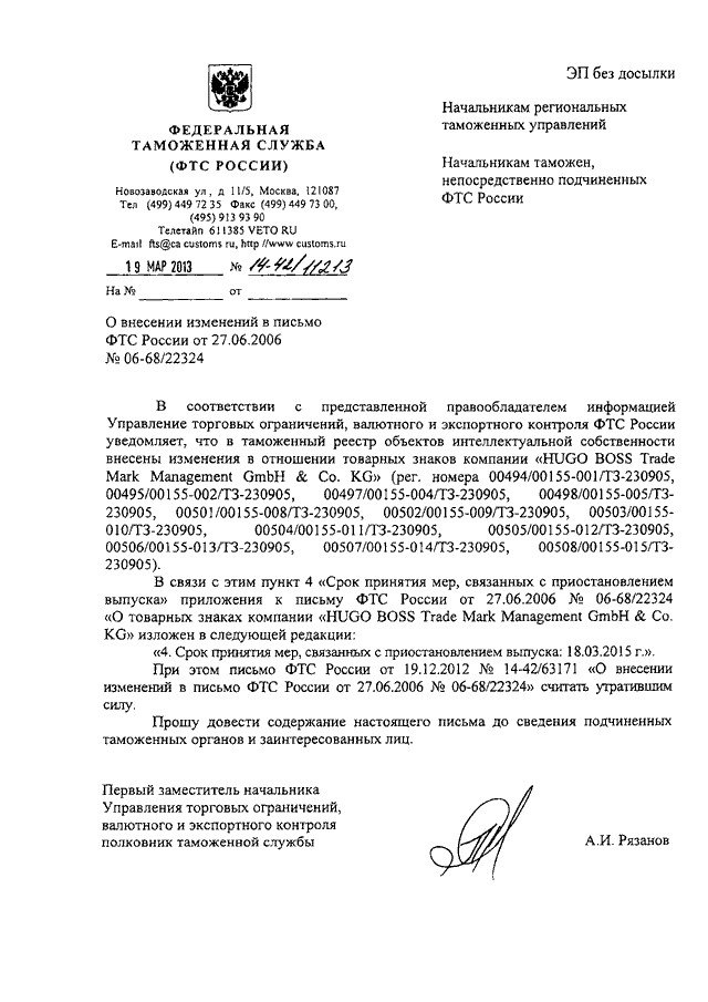 ПИСЬМО ФТС РФ от 19.03.2013 N 14-42/11213