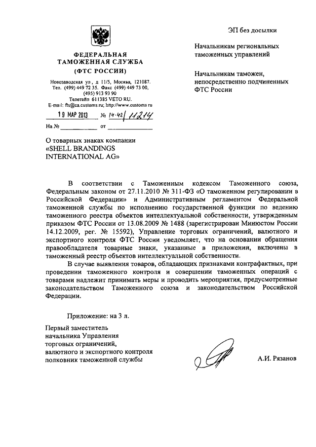 ПИСЬМО ФТС РФ от 19.03.2013 N 14-42/11214